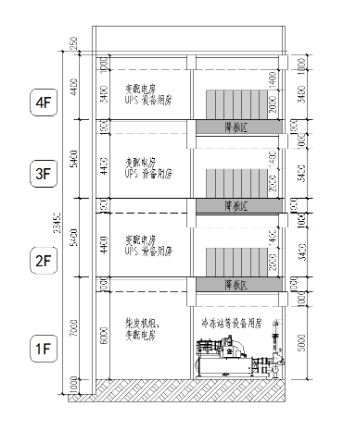 一層凈高:一層凈高以滿足變配電房和冷凍機房凈高需求為主,柴發機組設置在室內的亦考慮柴發機組凈高