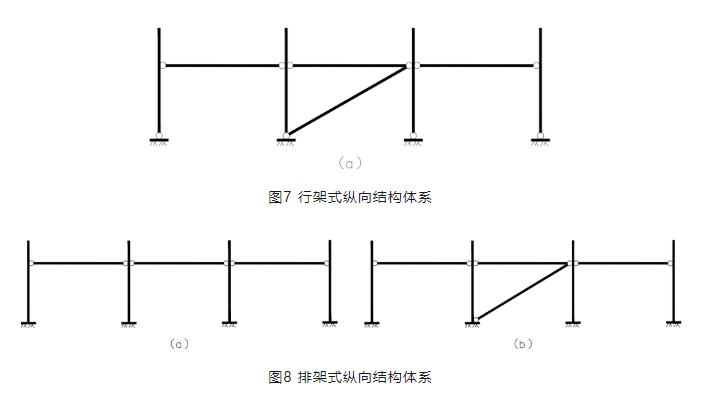 支架縱向結構體系根據立柱與基礎的連接形式不同,同樣分為兩種結構體系,柱底鉸接和柱底固結的形式。柱底鉸接形式為行架式縱向結構體系,見圖7。柱底固結為排架式縱向結構體系,見圖8。