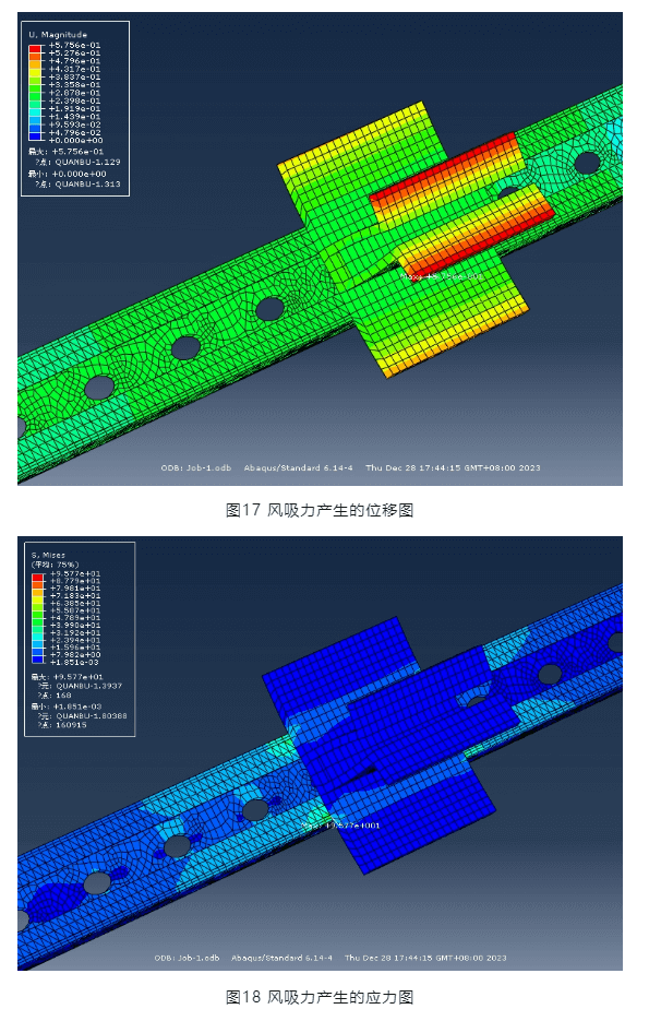 圖17及圖18為風吸力作用下,節點與橫梁的位移和應力圖。最大位移發生在壓塊上,為0.58mm,最大應力發生在橫梁上為96MPA,同樣小于鋼材強度設計值215MPA。因此,風吸力作用下,節點和橫梁同樣滿足強度要求。