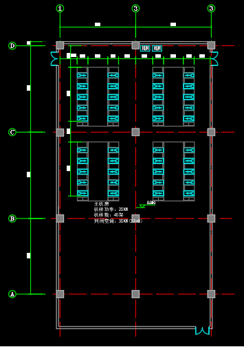 根據設計方案部署4個相同的雙排微模塊,每個微模塊分別部署10(8+2)臺列間級精密空調,共40(32+8)臺。列間級精密空調單機冷量:35kW;額定風量:8000m³/h;空調設備控制22℃送風,35℃回風;空調背面回風,正面出風;數量總計40臺。每座微模塊默認位置共10架IT機架,IT機架負載25kW /rack ,機房總計40架IT機架;微模塊封閉冷通道,冷通道寬1.8m。該方案布置方案如下圖: