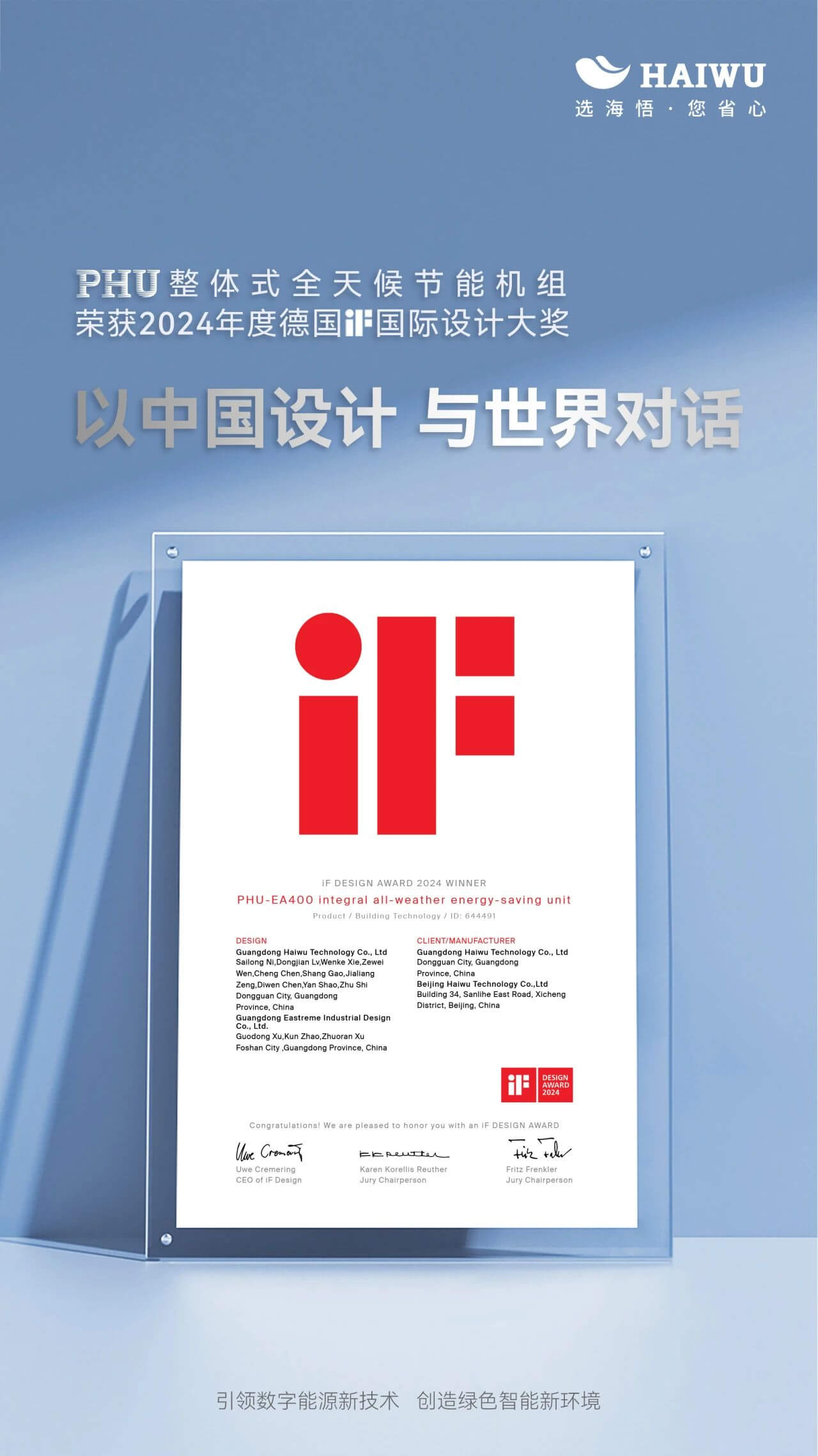 海悟PHU整體式全天候節(jié)能機(jī)組榮獲此項(xiàng)國際設(shè)計(jì)大獎(jiǎng),代表其獨(dú)特的設(shè)計(jì)、卓越的創(chuàng)新和強(qiáng)大的產(chǎn)品實(shí)力贏得了國際權(quán)威機(jī)構(gòu)的高度認(rèn)可。