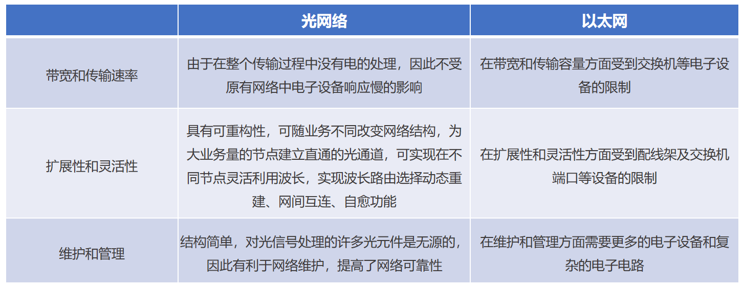 MPO/MTP預連接系統適用于高密度的機柜,采用模塊化設計,便于日后的擴展和維護,對于大規模光纖連接項目,使用MPO/MTP預連接系統可顯著節約成本。并且可以借助3D可視化平臺,實現跳線、鏈路的查詢和顯示,提高系統可靠性和維護效率,降低運維管理成本。隨著AI、大數據及云計算的蓬勃發展,網絡帶寬傳輸速率的要求不斷提高,光網絡將逐漸成為主流,而光網絡對比目前的以太網有以下幾點優勢: