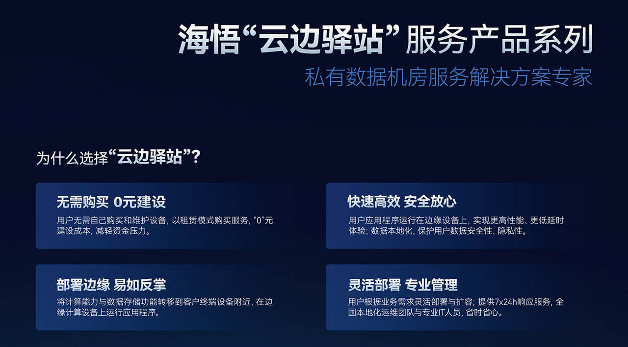 綜上所述,海悟云“云邊驛站”私有數(shù)據(jù)中心托管服務解決方案,以其卓越的安全性、高效的本地化算力、全方位的服務保障以及靈活的配置選項,正逐步成為企業(yè)數(shù)字化轉型道路上的堅實后盾。選擇“云邊驛站”,即是選擇了一個值得信賴的合作伙伴,共同開啟企業(yè)數(shù)據(jù)管理與應用的新篇章。