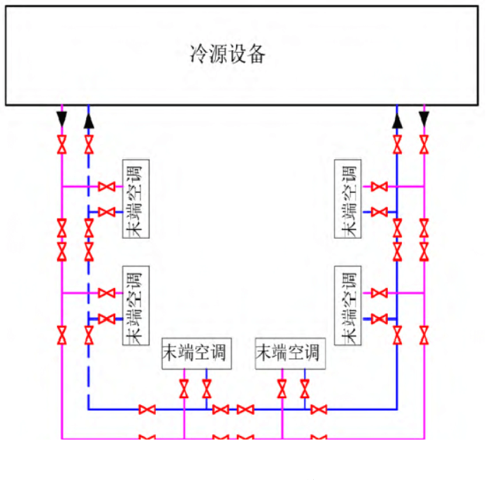兩種方案相似但有不同,最明顯的差異是冷卻液管路的不同。為了實(shí)現(xiàn)冷卻液循環(huán)的連續(xù)性,避免單點(diǎn)故障,根據(jù)各自建筑條件,項(xiàng)目A冷卻液管路采用雙供雙回的方式,項(xiàng)目B采用環(huán)形管路的方式,均可實(shí)現(xiàn)系統(tǒng)的冗余,見圖 5 和圖 6。通過對(duì)比分析,兩種方式實(shí)現(xiàn)的功能和可靠性是一致的,系統(tǒng)管路各有特點(diǎn),實(shí)際應(yīng)用過程中可以結(jié)合不同建筑布局、尺寸面積、出柜率,以及運(yùn)維通道等進(jìn)行選擇。
