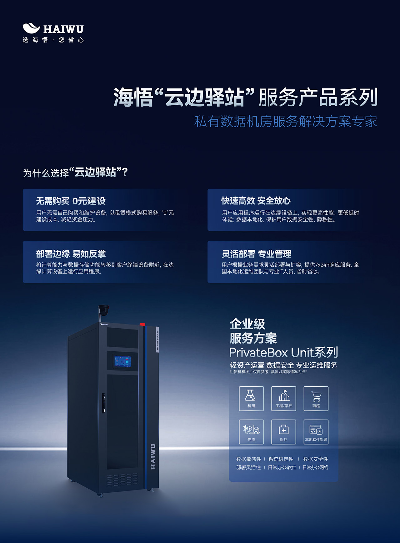 在這樣的時代背景下,企業對于本地化算力和數據安全存儲的需求愈發迫切。海悟云憑借敏銳的市場洞察力和深厚的技術實力,精心打造了“云邊驛站”企業級本地化私有數據機房托管服務解決方案,為企業提供了一站式、全方位的數據中心托管服務,助力企業在激烈的市場競爭中脫穎而出。